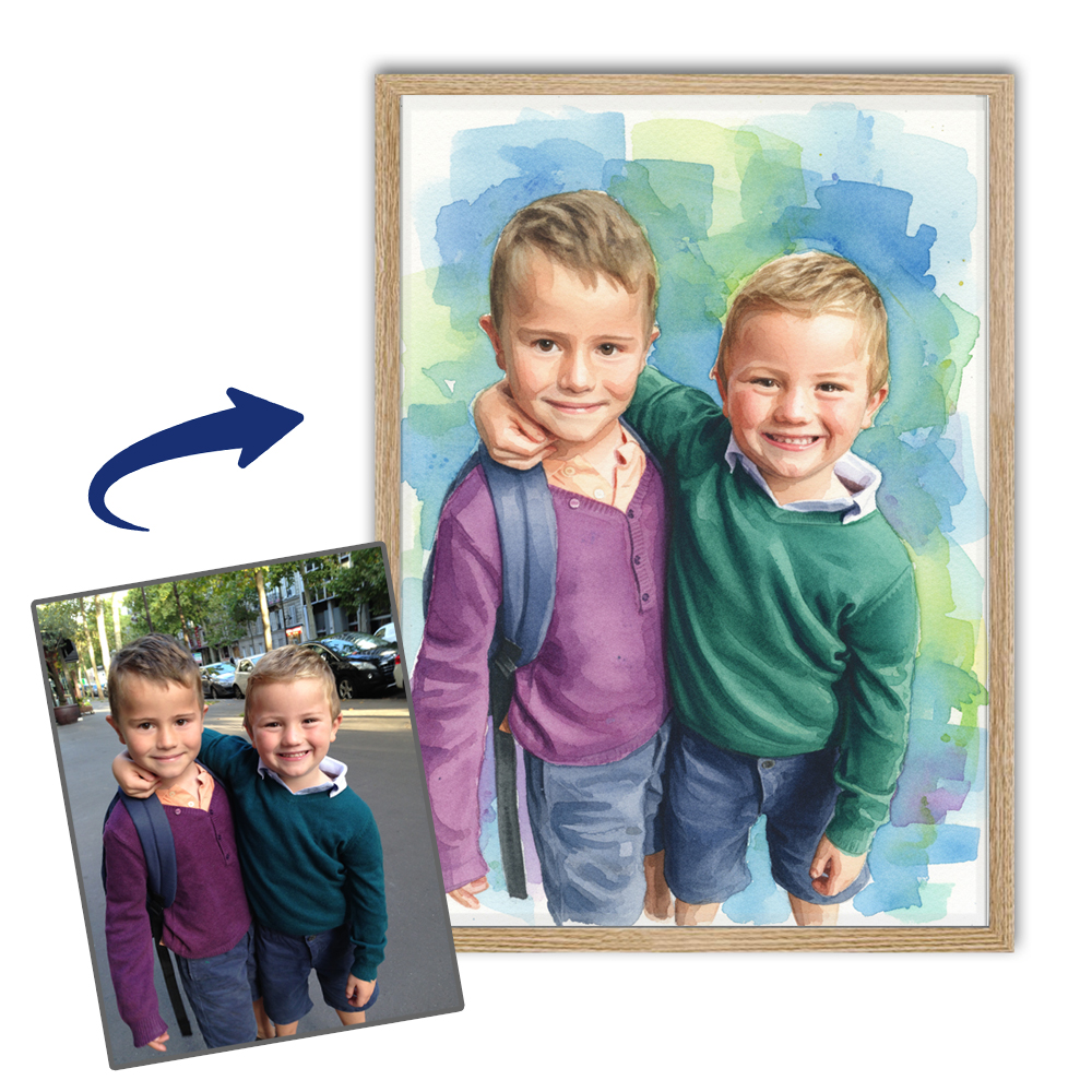 Laden Sie einfach Ihr Foto hoch: Unsere künstliche Intelligenz übernimmt die Umwandlung, und unser Grafiker perfektioniert das Ergebnis. Nach Ihrer Freigabe wird Ihr Werk in unserer Werkstatt auf dem gewünschten Medium gedruckt – Leinwand, gerahmtes Poster, Tasse, Trinkflasche, Erinnerungsbox, Türschild, Besteckset und vieles mehr.