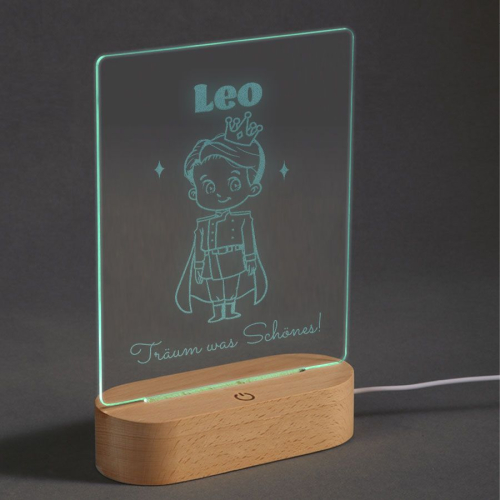 Eine hübsche Nachttischlampe zum Selbstgestalten für ein Kinderzimmer! Auf dem Plexiglas ist die weiße Gravur sehr gut sichtbar, selbst wenn der Rahmen ausgeschaltet ist. Die Gravur leuchtet auf, wenn Sie die Lampe einschalten. Die Lampe erleuchtet anschließend abwechselnd in verschiedenen Farben: blau, rot, rosa, grün, gelb... Diese originelle Lampe wird eingesteckt und bietet einen überraschenden Lichteffekt: im Inneren des Sockels befindet sich eine LED-Beleuchtung, die Ihre Gravur hervorhebt.