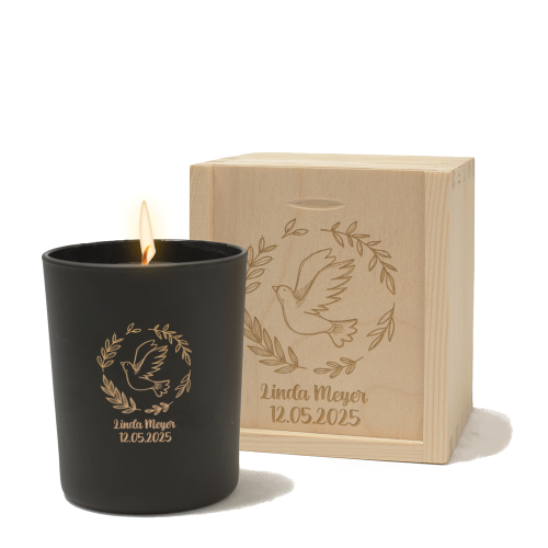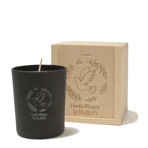 Auf Wunsch kann die Taufkerze in einer hochwertigen Holzbox verschenkt werden, die optional mit der gleichen Gravur verziert wird – für eine wirklich einzigartige Überraschung.