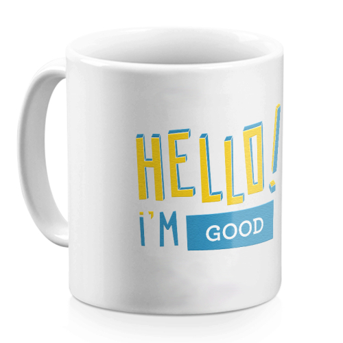 Eine personalisierte Tasse mit einem Hello-Motiv und dem Text Ihrer Wahl, zum Beispiel einem Vornamen.