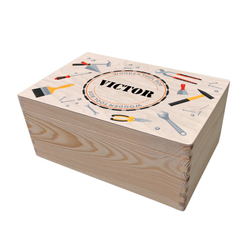 Die Kiste ist mit Werkzeugmotiven und dem Text Ihrer Wahl auf einer Zeile personalisiert. Ein unverzichtbares Aufbewahrungszubehör - Ihr Bastel- oder Werkzeugkasten ist auch ein dekoratives, einzigartiges und persönliches Objekt.