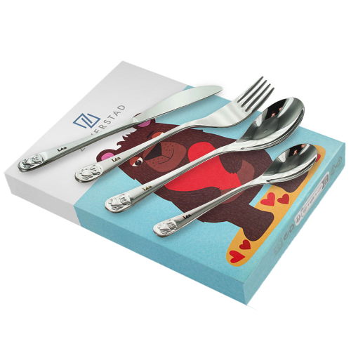 Ein 4-Teiliges Besteckset mit Bärchen-Motiven. Das Besteckset ist die ideale Geschenkidee zur Taufe oder zum ersten Geburtstag.