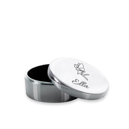 Eine schöne kleine Zahndose aus silberfarbenen Metall, die Sie mit dem Namen des Kindes und einem optionalem Motiv personalisieren lassen können.